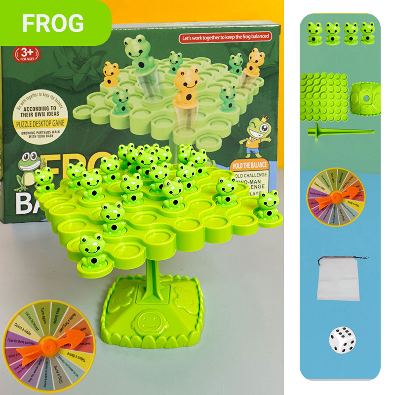 BRETTSPILLREGLER - I det første spillet tar 2 eller 4 personer tur til å slippe frosker, og hvis en side mister balansen, mislykkes den. I det andre spillet plasserer spilleren den lille frosken i en bestemt posisjon basert på terningkastet, noe som gir spillet et element av tilfeldighet. Til slutt avgjør det store eventyrhjulet hvem som taper og må ta straffen. Utforsk ulike interessante spill og spill et spennende spill med venner eller familie, så blir du spillkongen på festene.