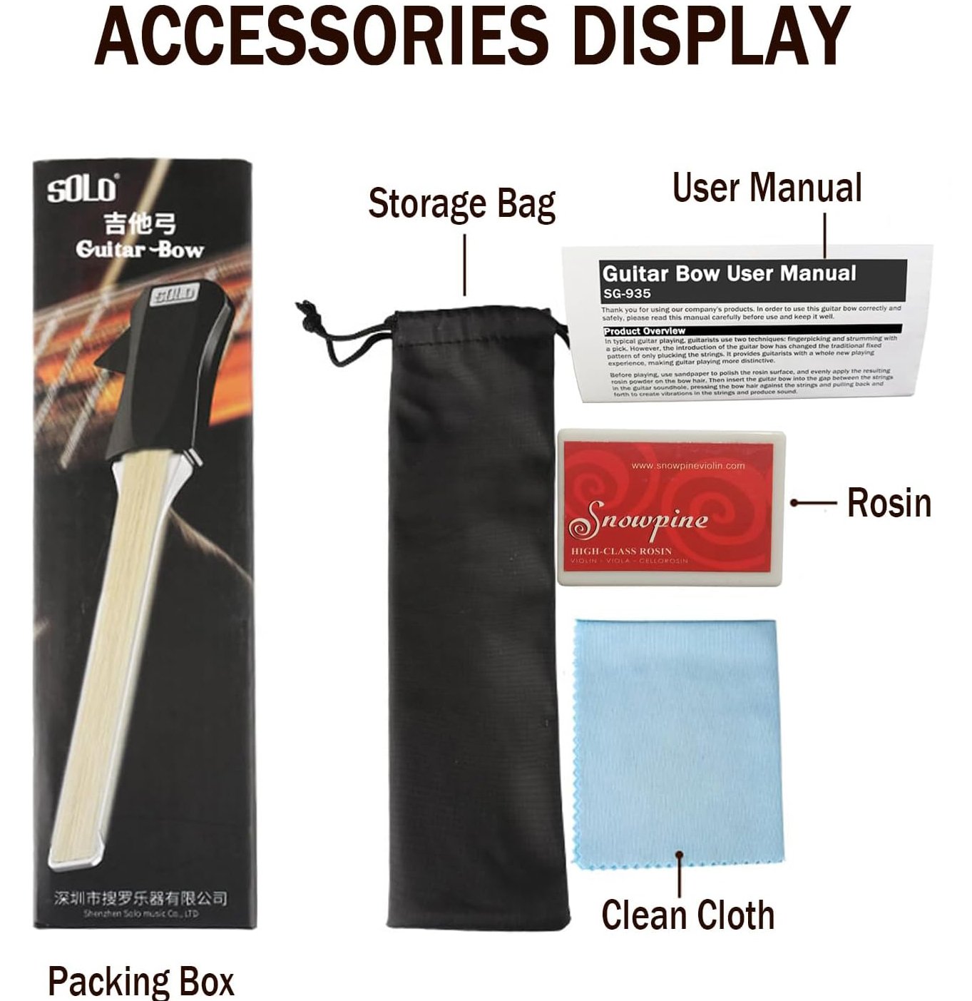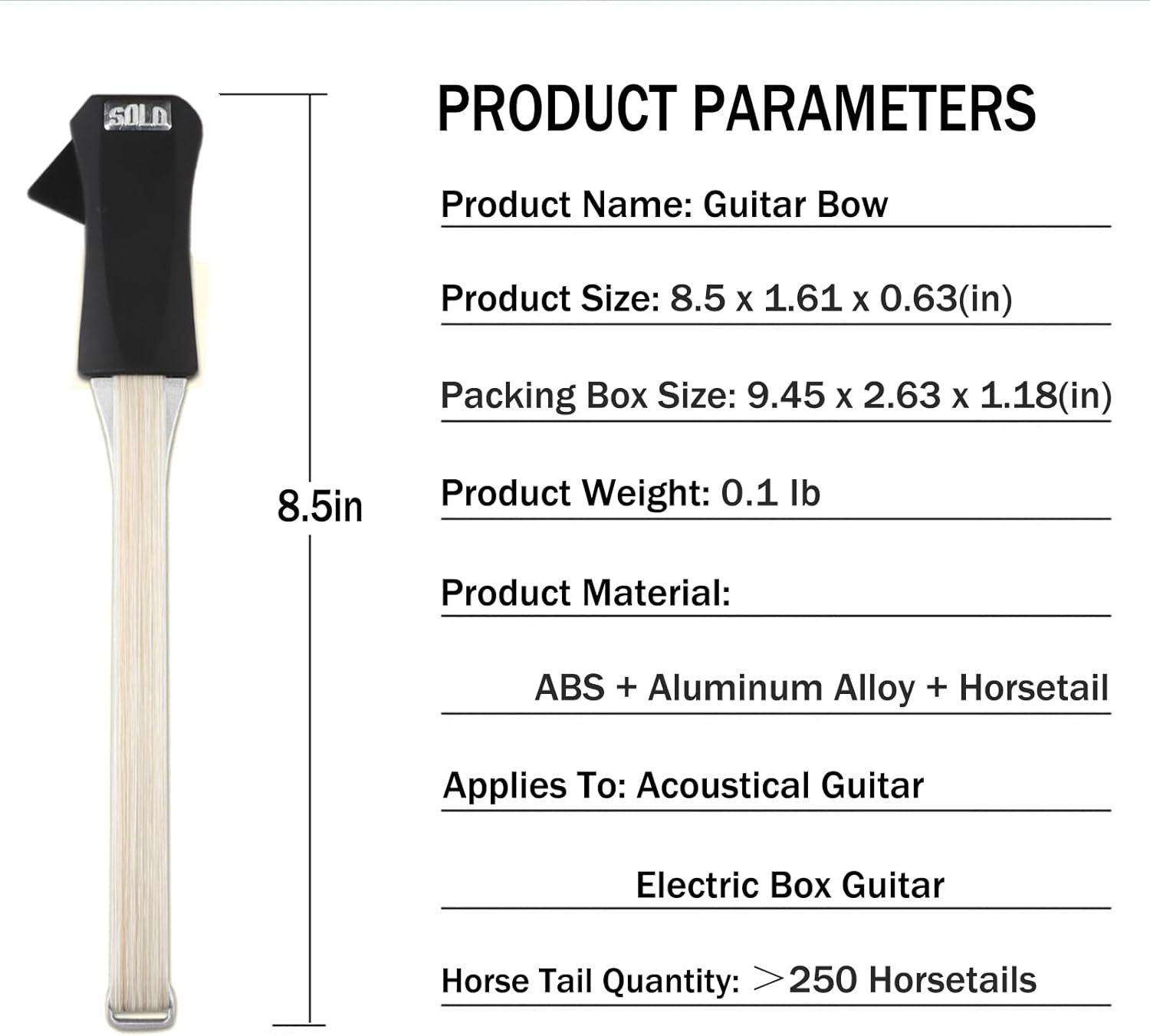 Die Gitarre spielen Bogen ist 8,5 Zoll lang und wiegt nur 0,1 Pfund, setzen Sie es in Ihre Gitarrentasche und tragen Sie es überall. Sie werden verstehen, wie man es innerhalb von Minuten zu spielen. Im Lieferumfang enthalten sind eine Gitarrentasche, eine Schachtel Kolophonium, ein Reinigungstuch, ein Benutzerhandbuch und ein Schleifpapier.