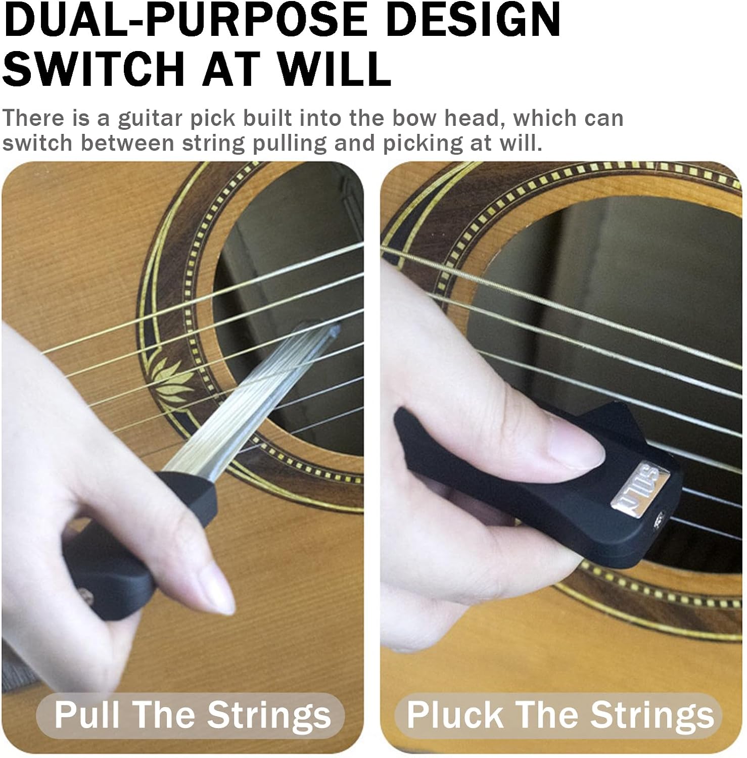 Sie können einzelne Saiten oder doppelte Stiche auf einmal spielen, da unser Bogen auf beiden Seiten behaart ist. Eingebautes Gitarrenplektrum im Griff, ermöglicht den sofortigen Wechsel von Gitarrenplektrum zu Bogen.