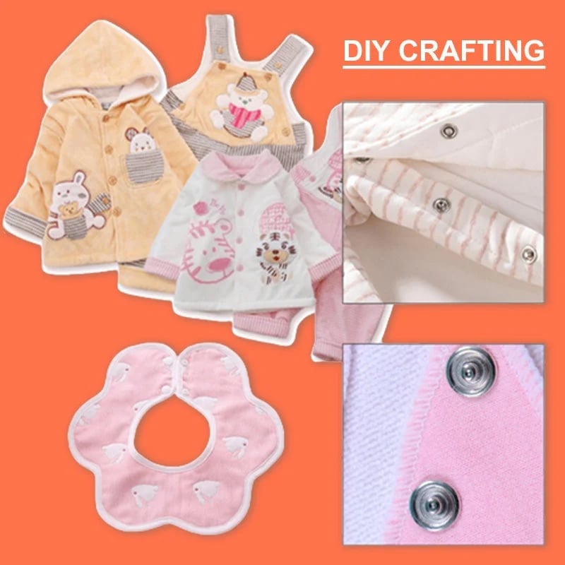 Dette verktøysettet med trykknapper er nok til å dekke dine forskjellige behov innen DIY-håndverk eller lage tynne klær. Den kan brukes på baby smekker krypende klær hatter skjorter baby jumpsuits spytt håndklær barbie / dukke klær kjæledyr klær eller andre steder du trenger det.