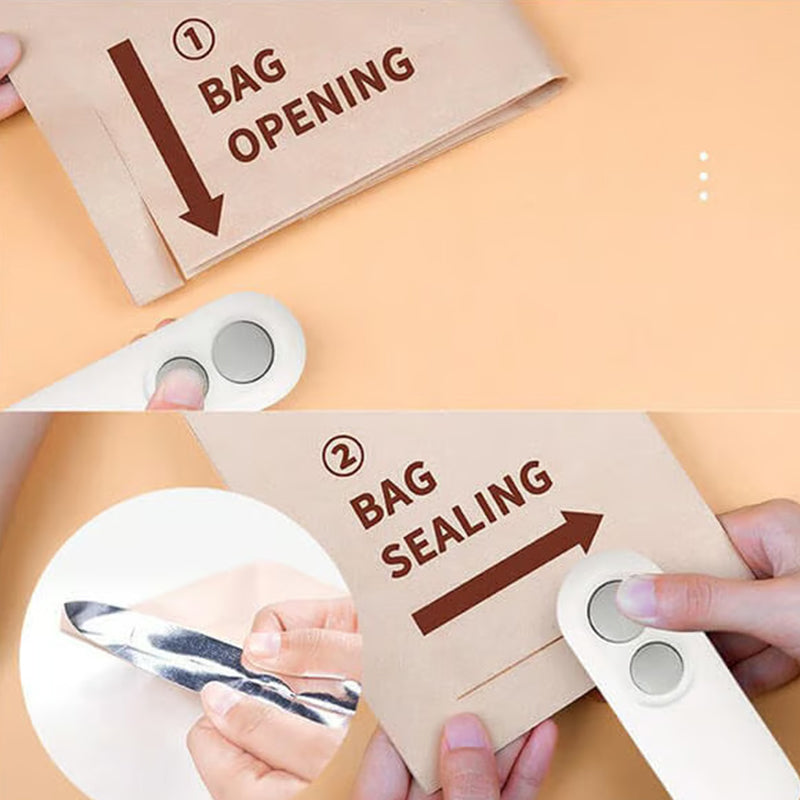 DUAL-FUNKSJONSDESIGN: Denne enheten integrerer både en forsegler og en kutter på en praktisk måte. Det skjulte bladet gjør at du enkelt kan åpne poser samtidig som sikkerheten ivaretas, noe som gjør den til det eneste verktøyet du trenger for posebehandling.